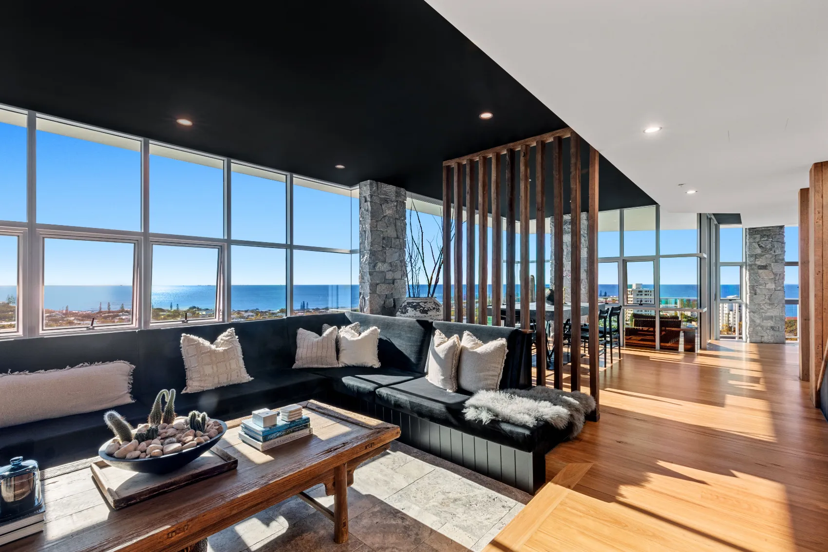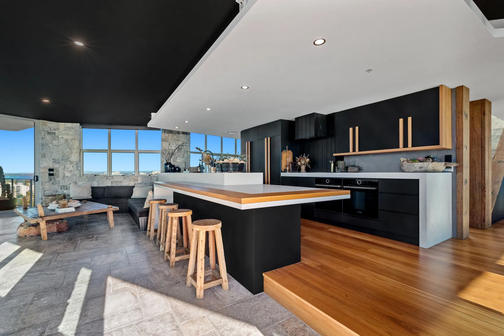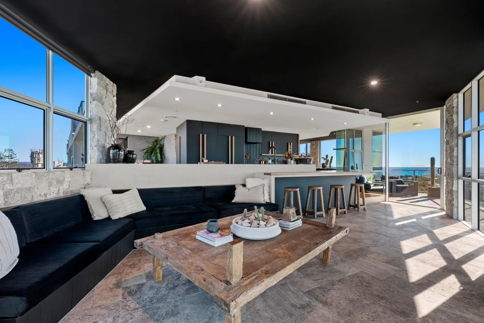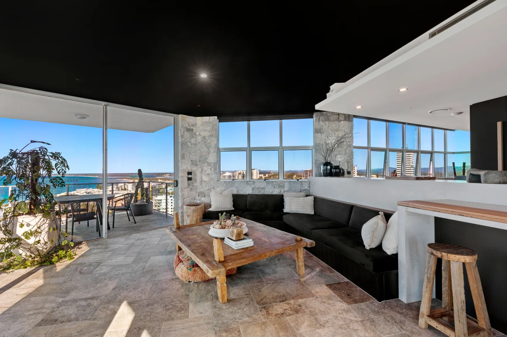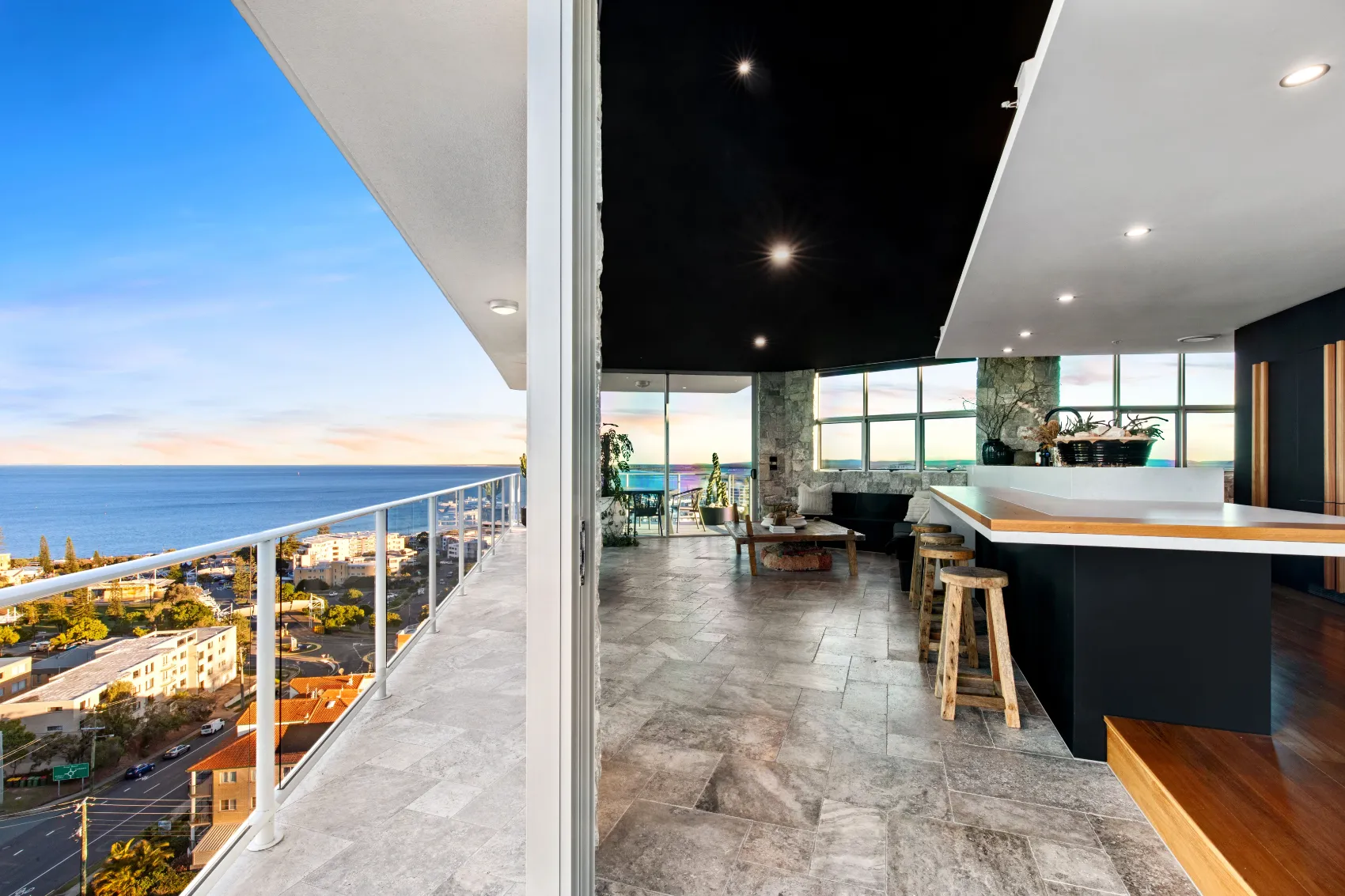 An 11th floor penthouse reimagined as a grand yet intimate coastal retreat. From the private lift entry, the space unfolds in layers — from recessed dining areas to an expansive rooftop terrace. Multiple outdoor zones offer places to gather, unwind and take in the view, with a strong connection between interior and sky. Every element is designed to frame the horizon and create a sense of calm above the city.